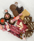 3 Chocolate Covered Oreos, 3 Peanut Butter Cups, 3 Valentine Pretzel Rods, 3 Graham Crackers, 1 Square of Fudge, Gummy Hearts and Salt Water Taffy